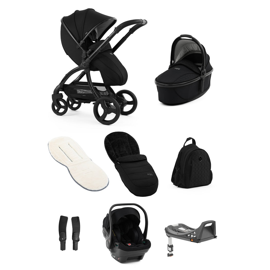 egg3® Luxury Bundle (Panther) comprises of a carrycot, reversible seat unit, chassis and accessories with a matching egg3 Shell i-size car seat and ISOFIX base.