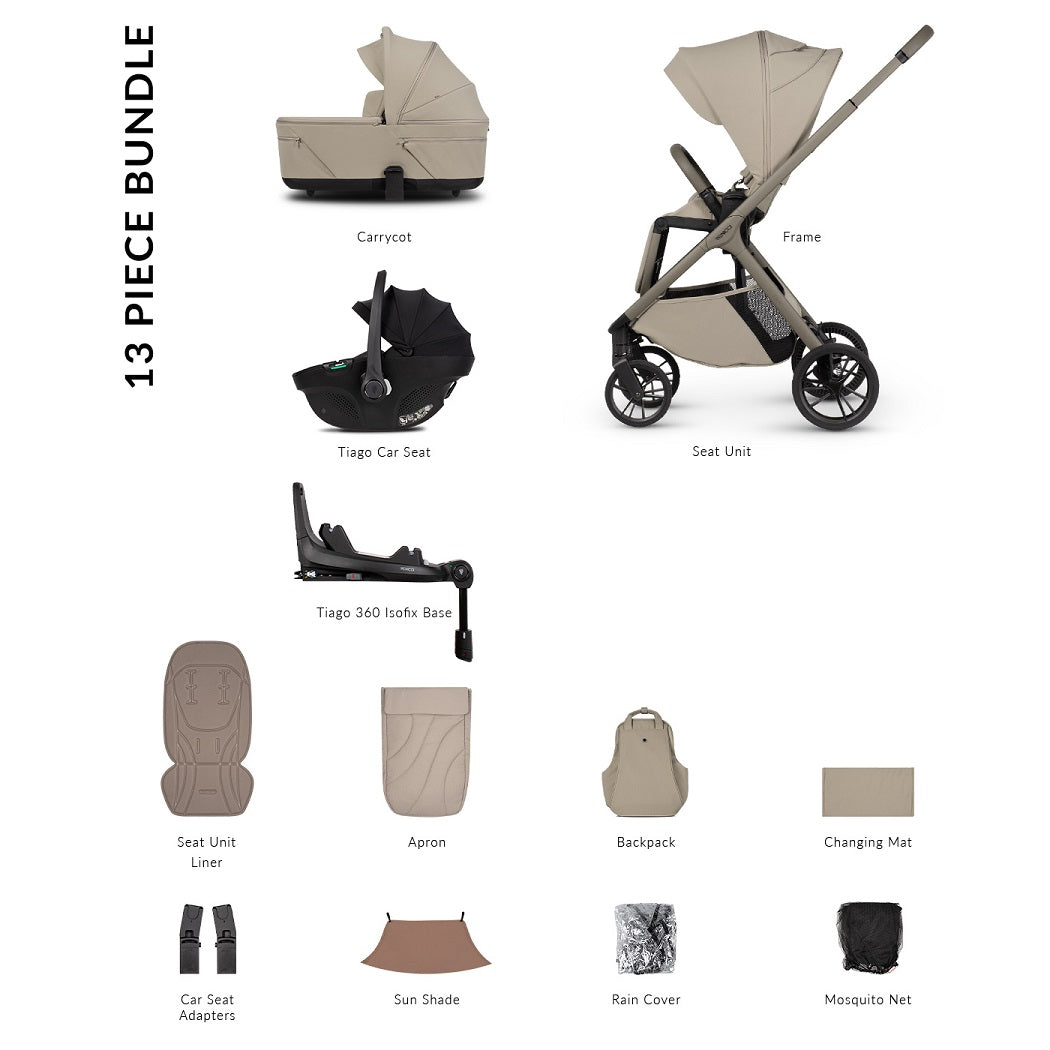 This complete luxury bundle includes a carrycot, reversible seat unit, ultra-light chassis, backpack changing bag, plus the Venicci Tiago 360 i-Size car seat with 360° ISOFIX base – giving you everything you need in one perfectly co-ordinated travel system.
