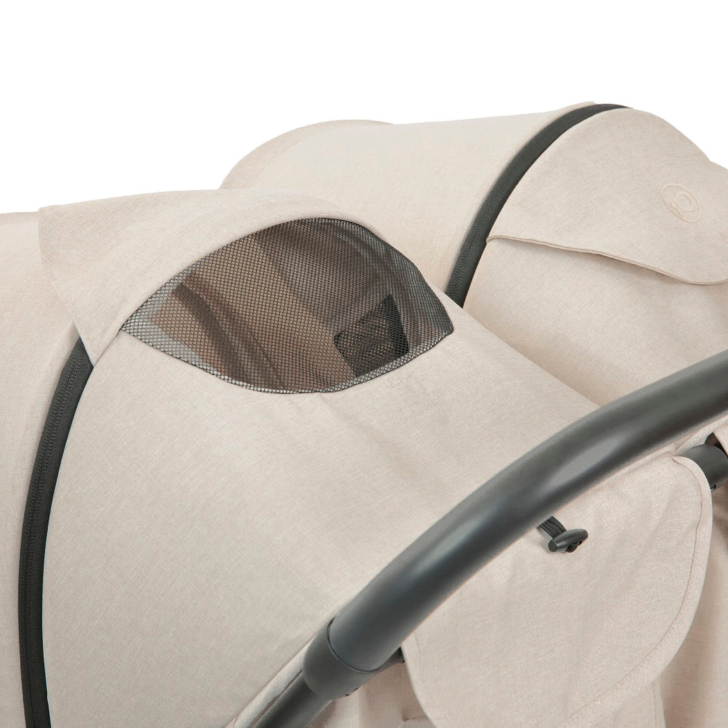 Built for all-year comfort, the Aries Double MAX features infinite recline backrests, two-position adjustable leg rests and ventilated hoods with pop-out sun visors. Peek-a-boo windows let you keep an eye on your little ones while improving airflow on warmer days.