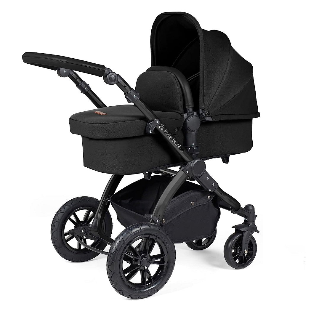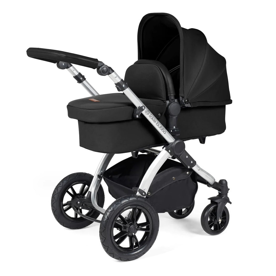 Ickle Bubba Stomp Luxe Travel System with Nimbus 180° Spin i-Size Car Seat, ISOFIX Base and Bubba&Me Crib (Black/Midnight/Black).