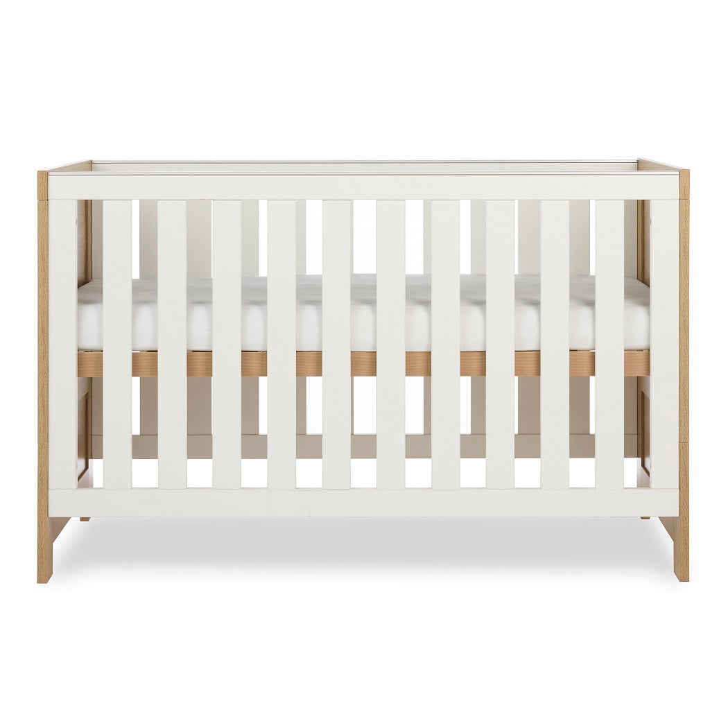 Create a warm and stylish nursery with the Obaby Nika Cot Bed in Oak & White, a beautifully designed cot bed that combines modern aesthetics with long-lasting practicality. Featuring natural oak-effect ends, clean white slatted sides and subtle gold accents, it’s the perfect centrepiece for any nursery.